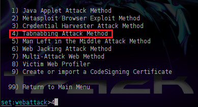 Next we will see the available attacks that we can use.Of course our choice here is option number 4 and the Tabnabbing Attack Method.