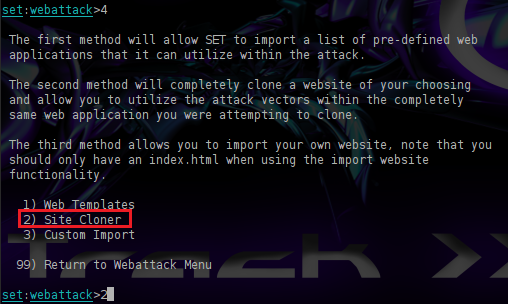 In the next menu we will choose option number 2 in order to clone the Website of our preference.Remember that the Tabnabbing attack only works with websites that they have fields for username and password so choose these kind of websites for cloning.