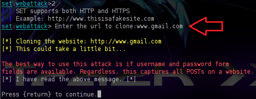Now it is time to choose the website that the SET will clone.In this scenario our choice will be the Gmail.