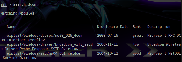 Our next step will be to try to discover the available exploits that the metasploit framework has in his database.So we are opening the metasploit and we are searching for the dcom exploit with the command search dcom.