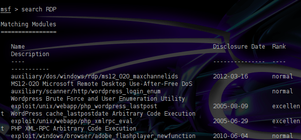 We are opening Metasploit Framework and we are searching for the available RDP modules.