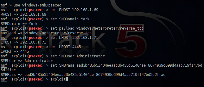 We can see that the workgroup is York.So we go back to the metasploit and we are configuring the psexec module You can see all the configurations that we have made in the next screenshot: