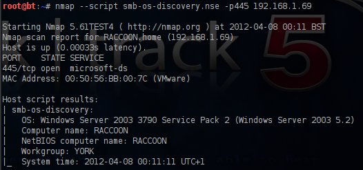 This metasploit module requires to know in which workgroup the remote target belongs.We can discover that very easily by using the Nmap script engine and executing the following script: