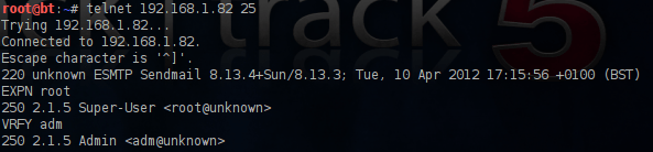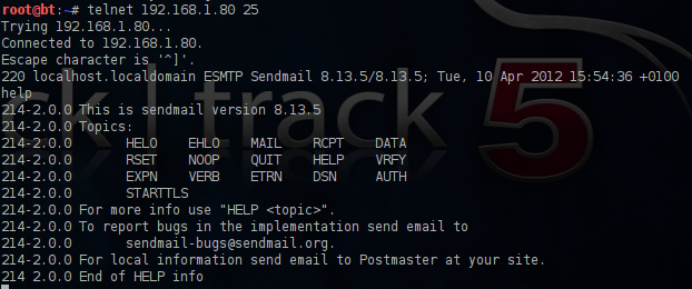 If you discover a host which is running an SMTP service (port 25) you can also use it for username enumeration.We can connect through telnet to the mail server and then we can execute the command help in order to see the available commands.