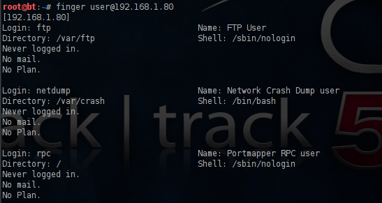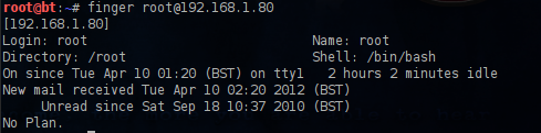 As you can see the root user is the only account which is logged on the remote host.Now that we have a specific username we can use it in order to obtain more information about this user with the command finger root@host.