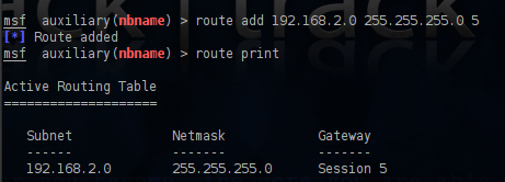 Before we configure the netbios scanner we will create the pivot by instructing metasploit to route all traffic from our meterpreter session to the network 192.168.2.0.