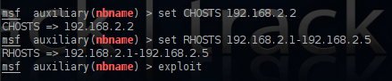 From the above table we can identify the existence of another network 192.168.2.0 which our machine belongs as well.So our next option is to try to find any other hosts that are part of this network.Metasploit Framework has a module called nbname which can discover other hosts through the NetBIOS service.