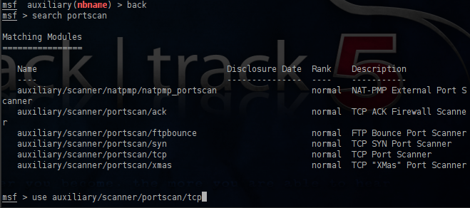 So we obtain another one IP address and our next step is to scan this IP in order to discover any open ports.We will search in the metasploit framework for the available port scanners and we will use the TCP scanner.