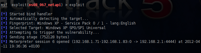 As you can see from the image above we have chosen as a payload a meterpreter bind_tcp and not the reverse_tcp.The reverse connection will not work in this case because the target IP address 192.168.2.1 will not know how to reach back our IP address.Now that everything is ready it is time to exploit the target.