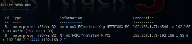 We have exploited the target machine and we have successfully opened a new meterpreter session.As the last line of the above screenshot indicates this was achieved through the pivot machine.The next image is showing that now we have two active sessions on computers which are on different subnets.