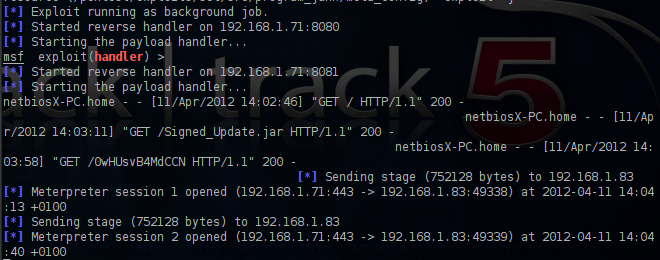 The payload of this applet has been encoded 4 times in order to avoid antivirus detection.So if one of the users runs this Java applet we will get a meterpreter session.
