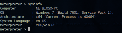 Now that we got access as a first step is to find some more information about the target with the command sysinfo.As you can see from the next image it is a Windows 7 machine.