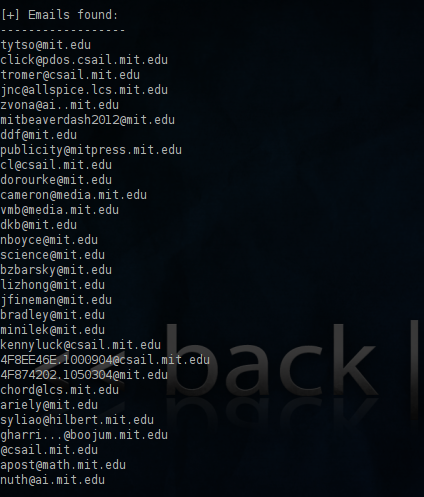 Below is a sample of the email addresses that the tool theHarvester has discovered.Of course we can combine the results with the module of the metasploit if we wish.