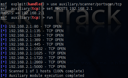 Now that we can reach the internal network through the compromised system we can use the TCP scanner of metasploit framework in order to discover any open ports on the remote target.