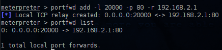 We can see that the port 80 is open.This is an indication that probably a web server is running on that port. In order to reach that port from our machine we need to set up port forwarding to the machine that we have exploited.So lets connect again to our meterpreter session and use the command portfwd -h in order to see the available options.