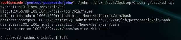 If we want to see the passwords that we cracked we can run the show command from john.For example ./john –show /root/Desktop/Cracking/cracked.txt