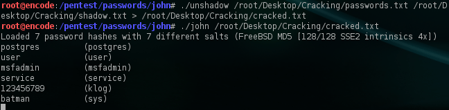 So we will save the hashes as well in a file called shadow.txt and we will use the famous password cracker john the ripper in order to crack those hashes.In backtrack john the ripper is located in the following path: /pentest/passwords/john.