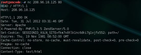 As we can see from the HTTP response header the type of the web server is Apache.Also we have managed to identify the technology from the X-Powered-By field name along with the version that supports the application which is PHP/5.3.5 and also the web application that is running on the web server which is a ZendServer.Alternatively if we don’t want to use the netcat utility we can use the telnet in order to obtain the header information from the web server.The image below is showing the usage of telnet in obtaining the HTTP Response Header from the same web server.