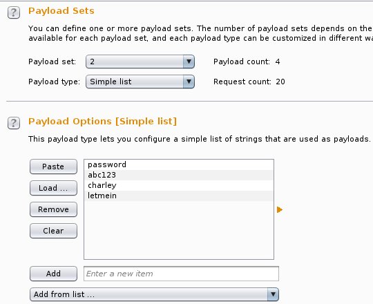 The Payload for Brute force can be SQL injection vectors in username and Password with Cluster Bomb.