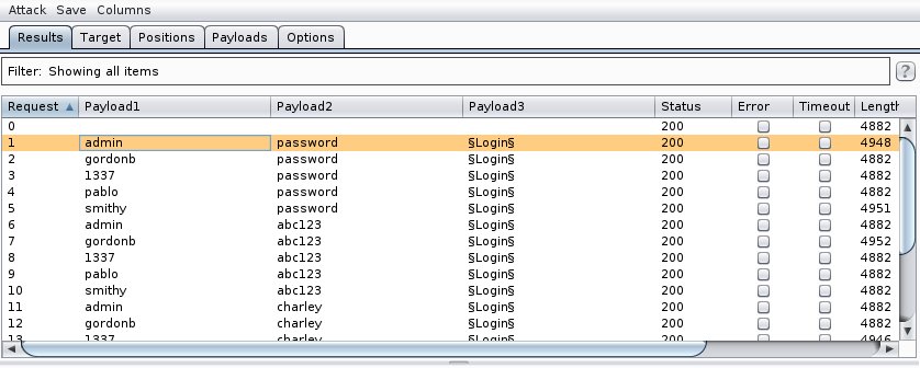 Everything now is ready and we can start the attack on the Intruder.The Intruder will start sending HTTP requests to the form based on our payloads and it will try all the possible combinations.
