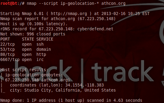 One of our first steps it can be to determine the origin of the IP address that our client has given to us.Nmap includes in his database a couple of scripts for this purpose.If we want to run all these scripts we can use the following command as it can be seen in the image below: