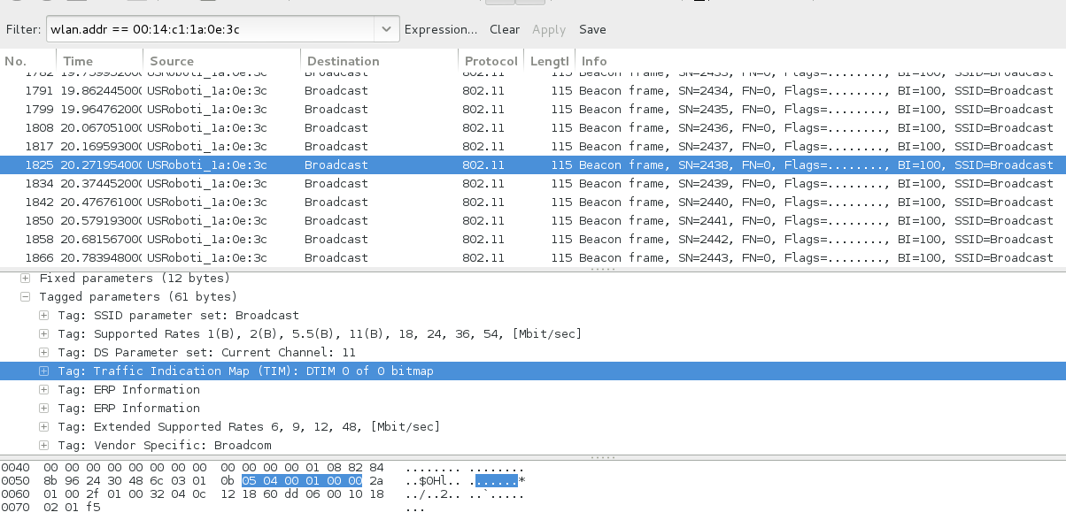 Alternatively we can check the beacon frames in wireshark and we will notice that the SSID is hidden.