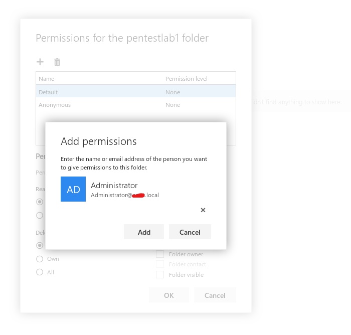 Accessing the compromised account from Outlook Web Access (OWA) portal and selecting the permissions of the inbox folder will open a new window that will contain the permissions of the mailbox.