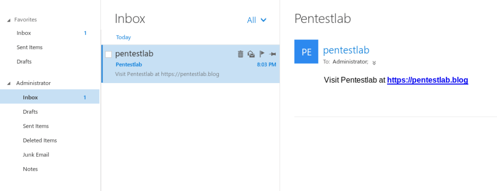 The mailbox of the Administrator will open in another tab to confirm the elevation of privileges.