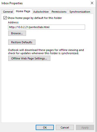 The Outlook Home Page is a legacy feature which allows the user to customize the default view of any Outlook folder. An external or internal URL can be loaded and displayed whenever a folder is opened. The ieframe.dll is used to render the contents of the URL. Etienne Stalmans discovered that it is possible to inject a malicious page into the Outlook Home Page function in order to get code execution. The payload will triggered when the user navigates out of the inbox folder or when Outlook is restarted. This attack can be executed directly from Ruler. Running the following command will display the current homepage.