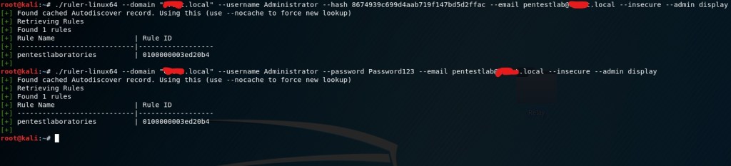 ./ruler-linux64 --domain "pentestlab.local" --username Administrator --hash 8674939c699d4aab719f147bd5d2ffac --email pentestlab@pentestlab.local --insecure --admin display ./ruler-linux64 --domain "pentestlab.local" --username Administrator --password Password123 --email pentestlab@pentestlab.local --insecure --admin display