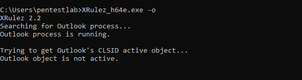 An alternative tool for injecting malicious rules is XRulez. The tool can be executed from a compromised Windows host. The user needs to have Outlook open for the injection to be successful. Executing XRulez with the option -o will check if the Outlook process is running.