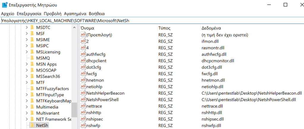 reg add "HKEY_LOCAL_MACHINE\Software\Microsoft\Windows\CurrentVersion\Run" /v Pentestlab /t REG_SZ /d "C:\Windows\SysWOW64\netsh"