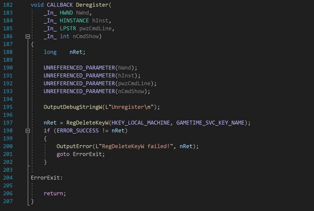 The code uses also the Deregister callback function to delete the created registry key GameTime from the system as a clean-up process.