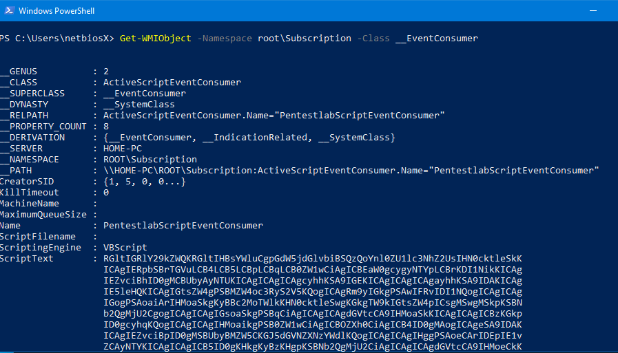 $EventConsumerToCleanup = Get-WmiObject -Namespace root/subscription -Class CommandLineEventConsumer -Filter "Name = 'Pentestlab-WMI'"