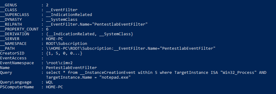 $EventFilterToCleanup = Get-WmiObject -Namespace root/subscription -Class __EventFilter -Filter "Name = 'Pentestlab-WMI'"