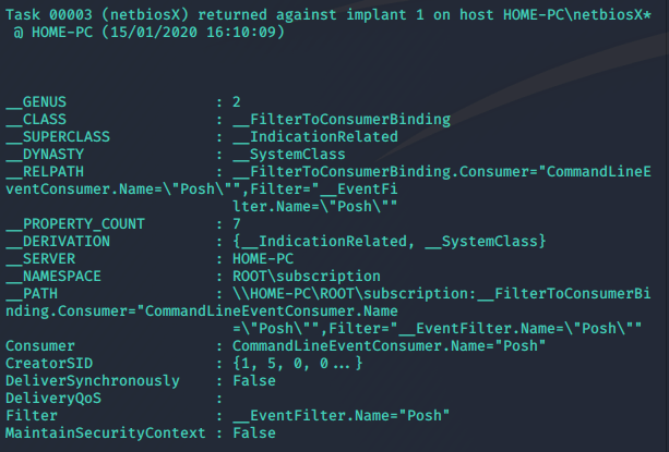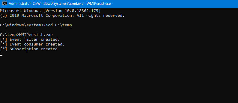 Running the executable on the target host or through Cobalt Strike (execute-assembly option) will create the Event Filter, Event Consumer and the subscription.
