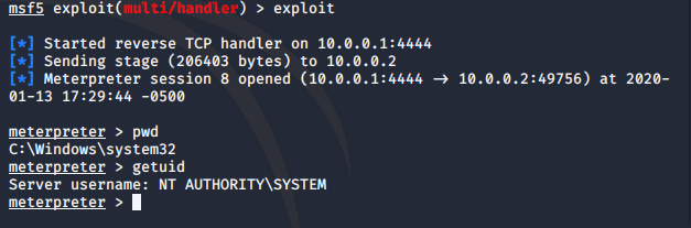 After 5 minutes on the next reboot the payload will be delivered and a Meterpreter session will established with the target host.