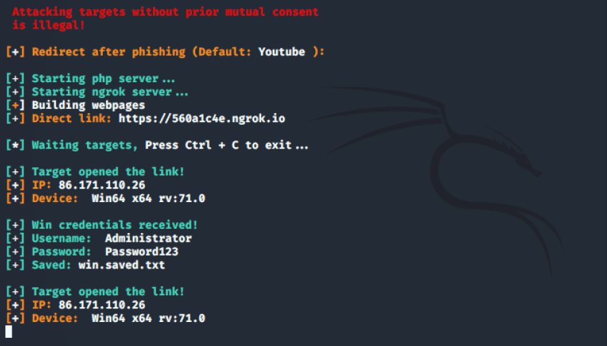 Lockphish is another tool with capability to implement a phishing attack against the Windows logon screen. The associated template will be hosted into a PHP server and by default uses YouTube in order to redirect the user after his credentials have been submitted.
