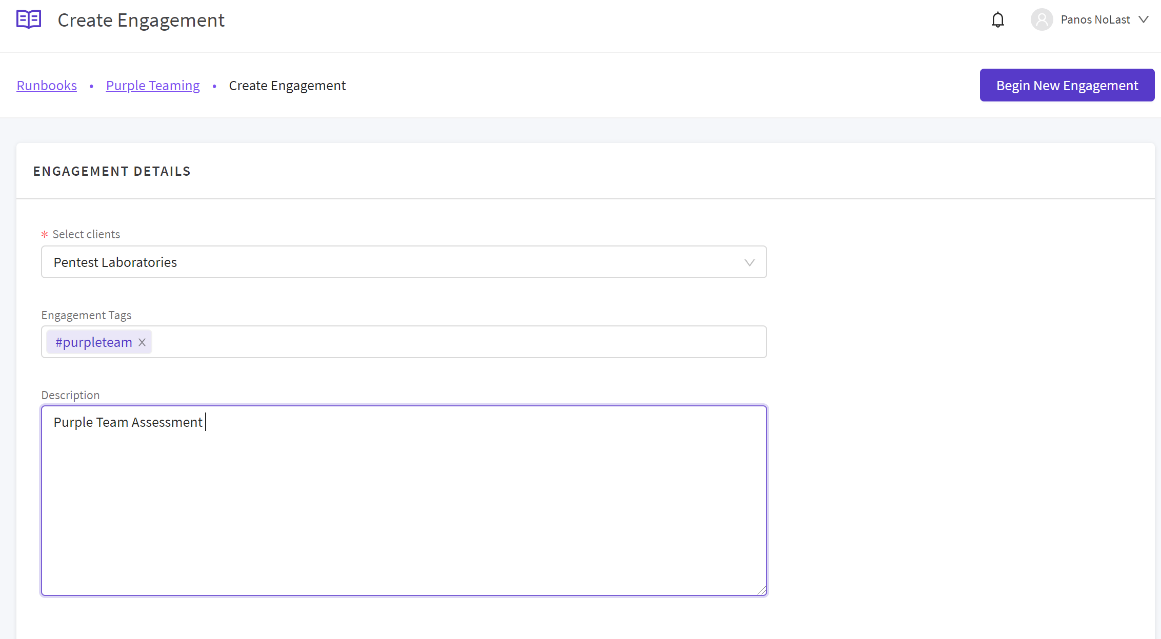 The engagement required some further information such as the Client name in this case Pentest Laboratories, tags which could be custom or associated with MITRE TTP’s and description for any other relevant project information.